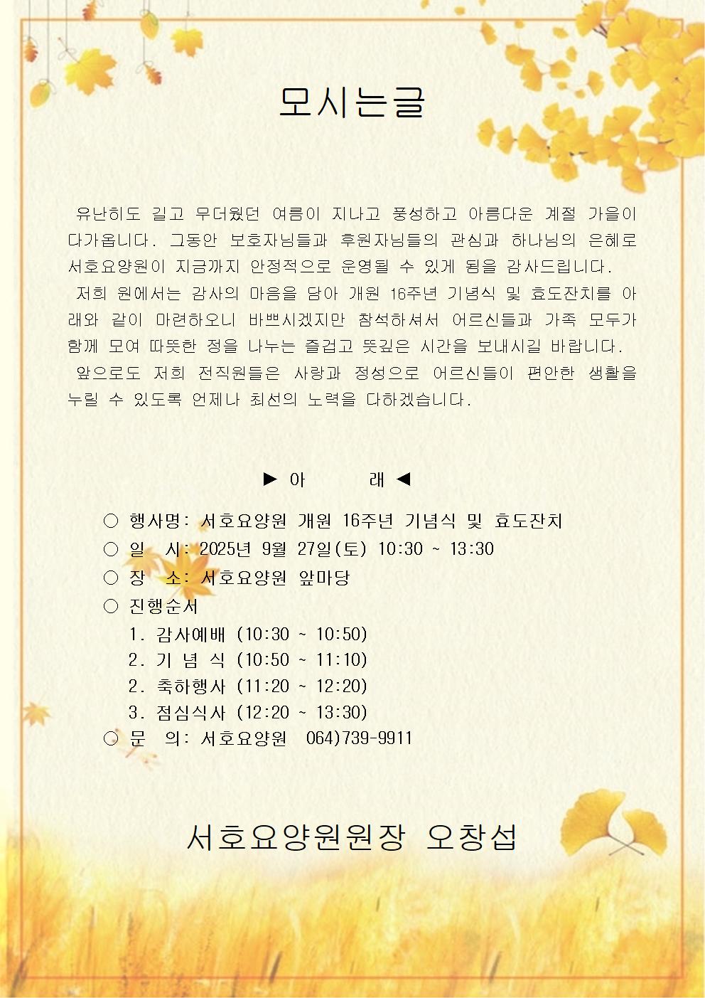 홈커뮤니티서호소식 서호소식 서호요양원 개원 16주년 기념식 및 효도잔치 작성자 Admin 작성일 2025-09-08 11:22 조회 106 좋아요 1 싫어요 0 인쇄 « 2025년 3분기 서호요양원 소식지 목록보기 답글쓰기 Powered by KBoard