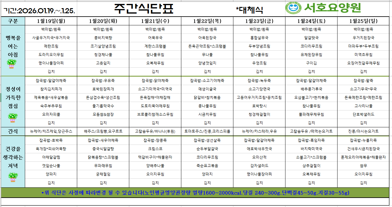 홈커뮤니티주간식단표 주간식단표 2026.01.19.~01.25.주간식단표 작성자 kli63a 작성일 2026-01-15 08:24 조회 32 좋아요 0 싫어요 0 인쇄 전체 0 추천순 작성순 최신순 작성자 비밀번호 사진 첨부파일 « 2026.1.12.~1.18.주간식단표 2026.01.26.~2026.02.01.주간식단표 » 목록보기 답글쓰기 글수정 글삭제 Powered by KBoard